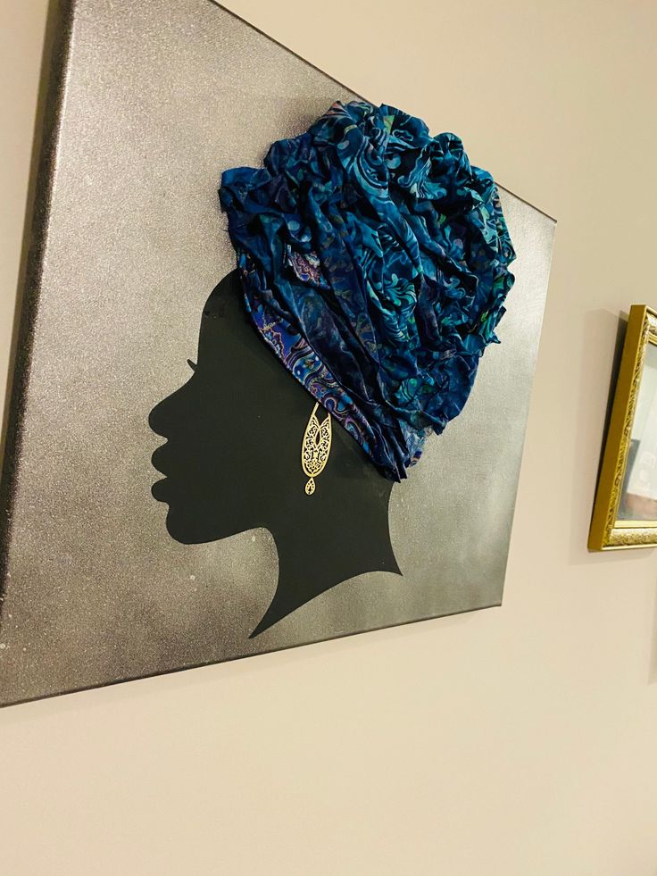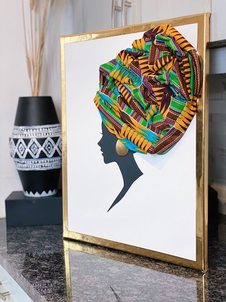 A painting of an African woman with African print head wrap mounted on it firmly.